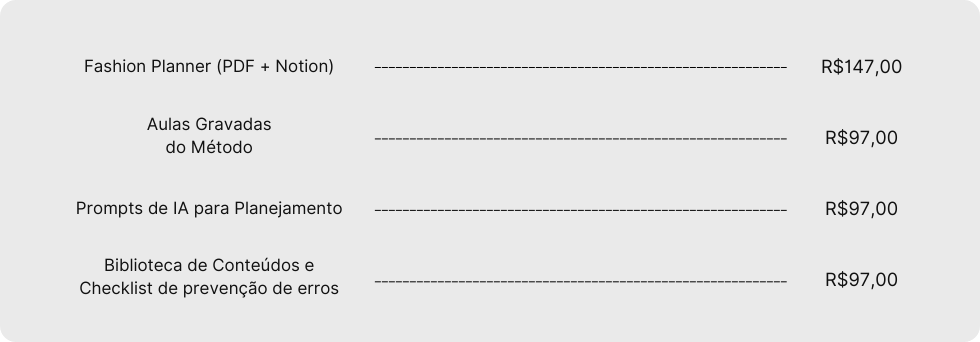 Esse seria o valor total de cada produto vendido separadamente, e que facilmente poderia custar muito mais, visto que são ferramentas desenvolvidas a partir da prática real no planejamento de moda
