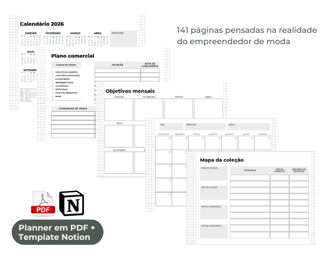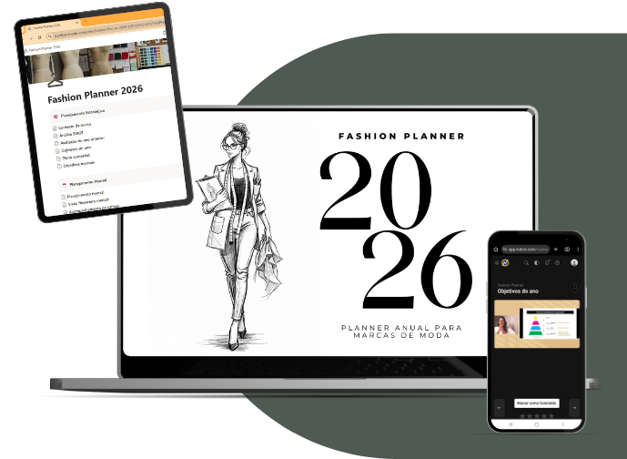 Um planner estratégico para negócios de moda, pensado para ajudar você a planejar, organizar e acompanhar decisões importantes do seu negócio ao longo do ano.