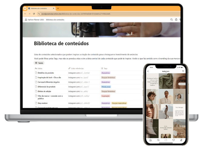 Acesso a uma biblioteca com 100 conteúdos para Instagram, que podem ser usados no feed ou em anúncios, além de um checklist de erros comuns em negócios de moda para evitar decisões que geram prejuízo e retrabalho.